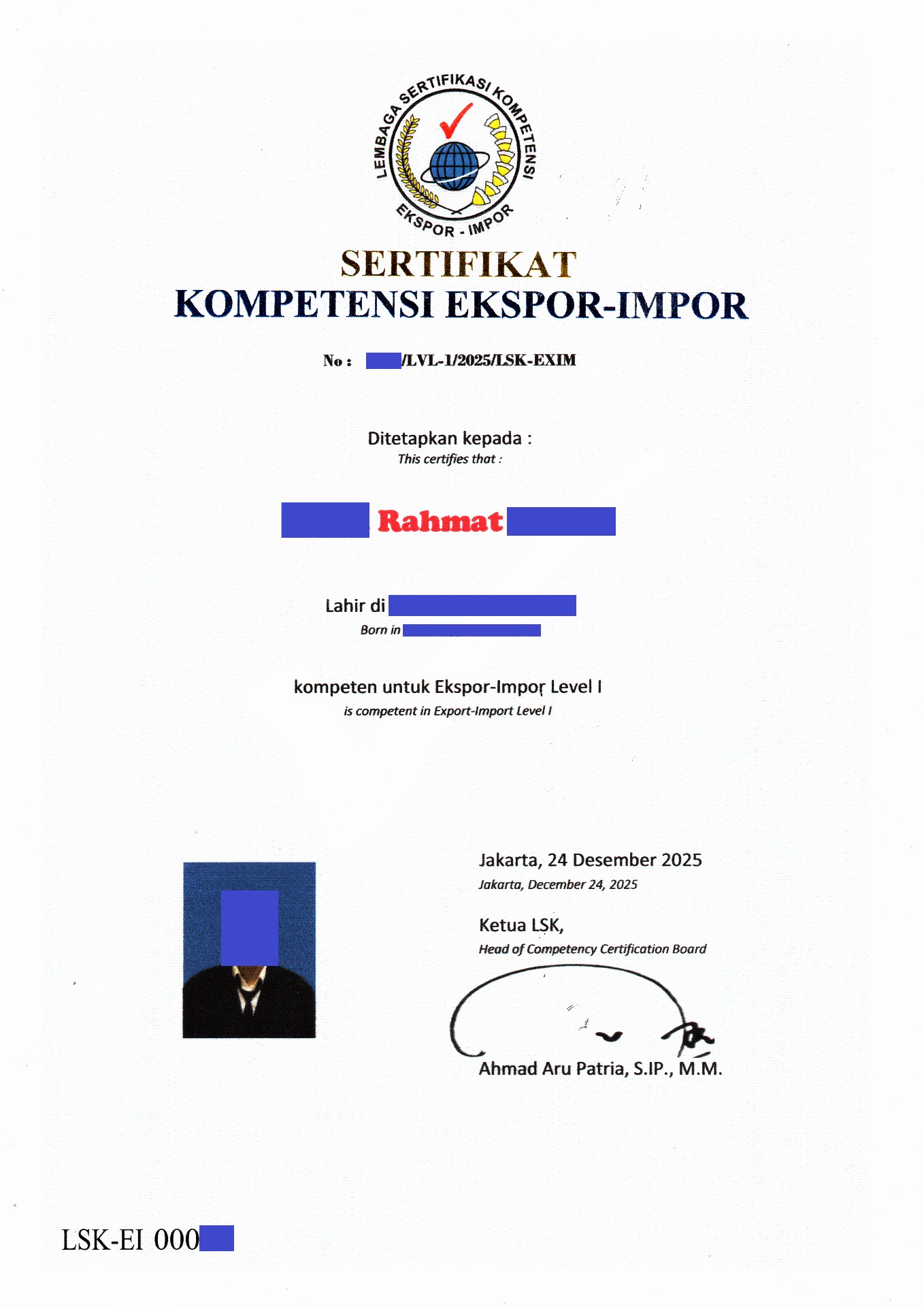 "Sertifikat Kompetensi Ekspor-Impor dari Lembaga Sertifikasi Kompetensi Ekspor-Impor"